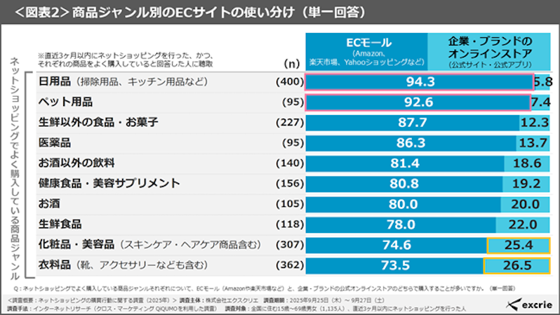 一方、衣料品と化粧品・美容品では企業・ブランドのオンラインストアでの購入率が他の商品ジャンルに比べて高くなっています。(図表2)