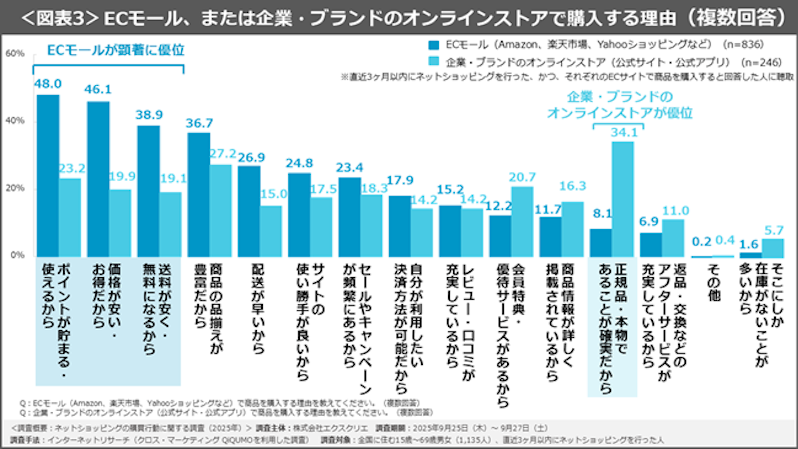 ECモールを選択する理由として「ポイントが貯まる・使えるから」が最多となり、「価格が安い・お得だから」、「送料が安く・無料になるから」などの経済的メリットに関連する理由が挙げられました。一方、企業・ブランドのオンラインストアを利用する理由について調査したところ、「正規品・本物であることが確実だから」が最多となりました。(図表3)