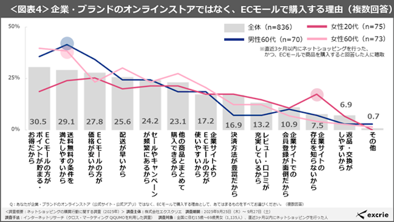 次に、企業・ブランドのオンラインストアではなく、ECモールで購入する理由を聴取したところ、女性20代では「企業サイトの存在を知らないから」、男女60代では「送料無料の条件を満たしやすいから」が特徴的となっています。(図表4)