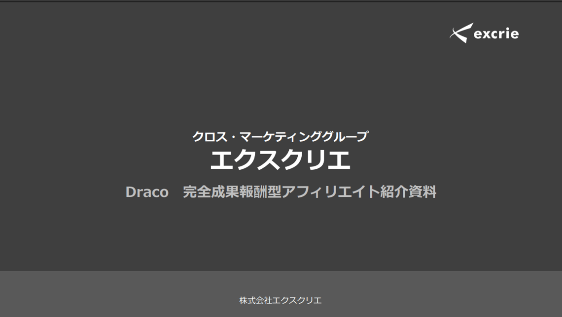 資料概要 アンケートという特性を活かし、必ず読んでもらえる広告を出すことができます。ニーズに合わせた広告内容の分岐も可能で、アンケート結果も集計できます。 このような方にオススメです! Draco 完全成果報酬型アフィリエイトの専任体制や実績について詳しく知りたい方 完全成果報酬型のアフィリエイト施策を行いたい方
