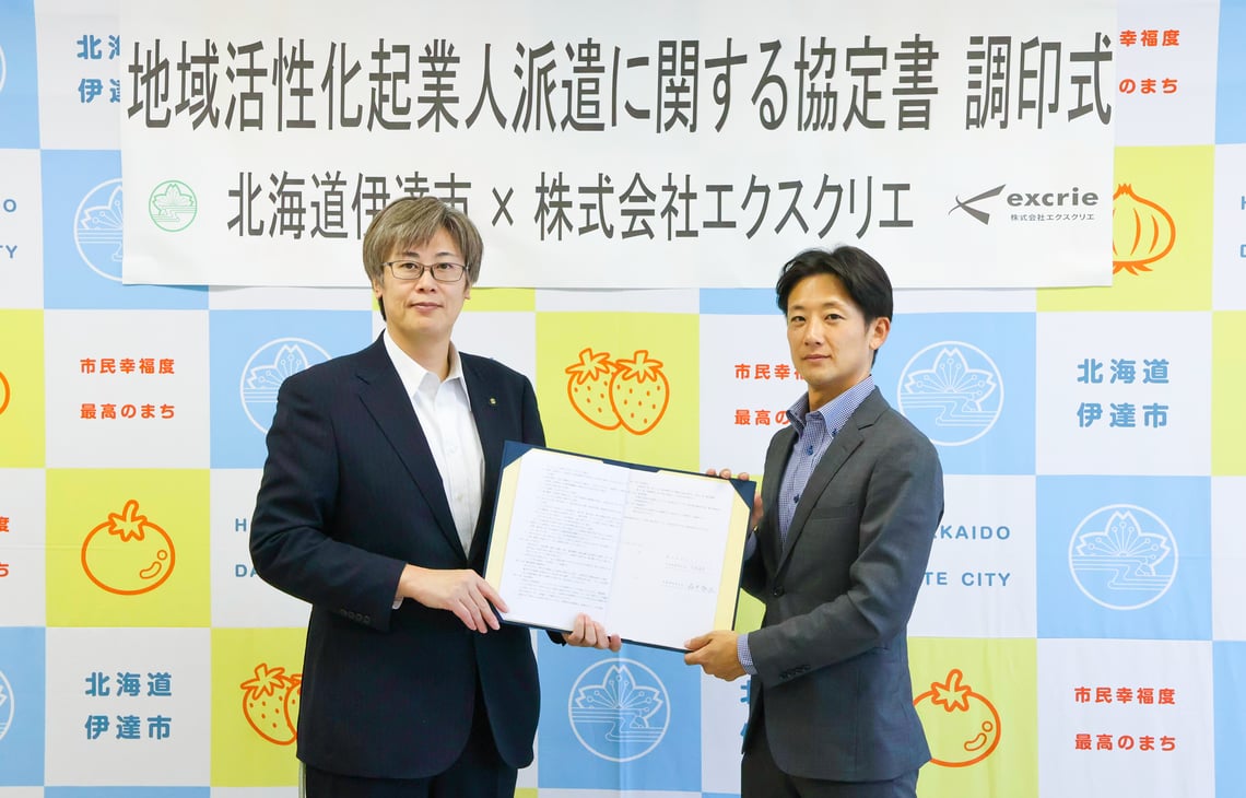 2024年12月12日に、伊達市長 堀井 敬太、及び株式会社エクスクリエ代表取締役副社長 小笠原 亨が出席し、北海道伊達市と株式会社エクスクリエの地域活性化起業人派遣に関する協定の締結式を執行しました。