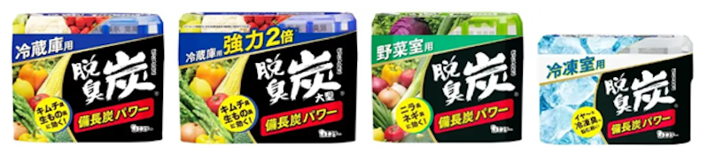 ※(商品左から)「脱臭炭 冷蔵庫用」、「脱臭炭 冷蔵庫用 大型」、「脱臭炭 野菜室用」、「脱臭炭 冷凍室用」