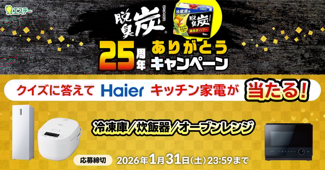 キャンペーン期間は2025年10月20日(月)~2026年1月31日(土)までとなっており、クイズに正解した方の中から抽選で合計25名様に冷凍庫、オーブンレンジ、炊飯器などのキッチン家電が当たります。