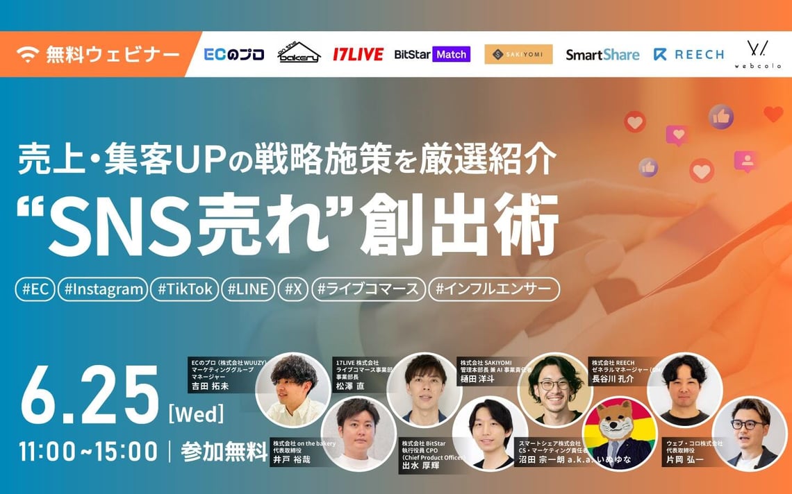LINE、Instagram、TikTok、Xといった4大SNSの成功戦略に加え、SNS運用・集客を強化するキャンペーン施策の打ち手やインフルエンサーマーケ、ライブコマースの成功事例にいたるまで各SNS・販促戦略のプロフェッショナル8社が集い、チャネル横断でD2C・ECの売上やサイト集客を伸ばす戦略施策を厳選してお届けします。