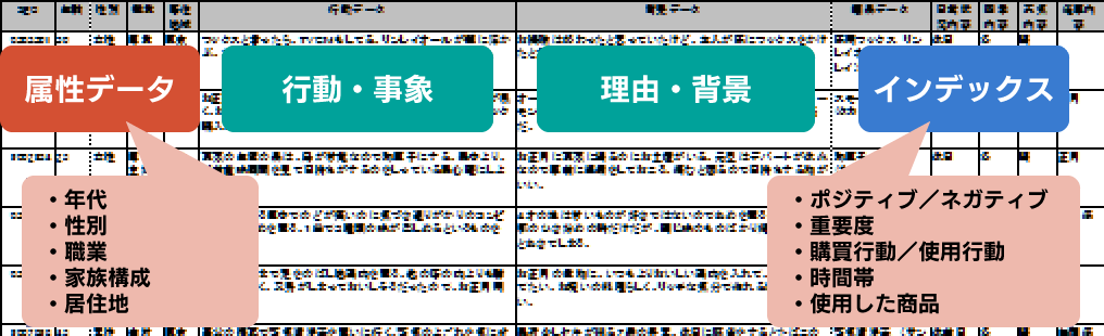 また、生活者が書いたままのデータでは的が外れたデータや具体的でないデータも多くありますので、必ずフィードバックして修正をお願いすることで、マーケティングに活用できるデータに仕上げます。